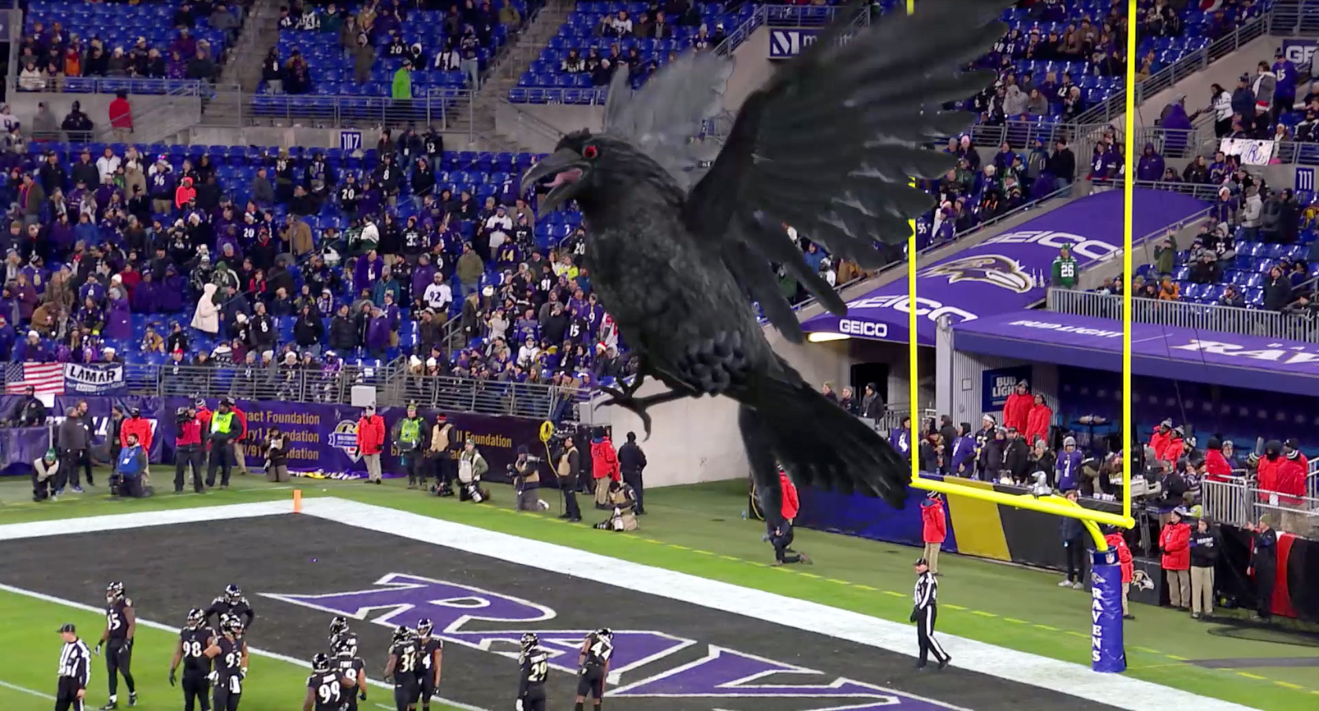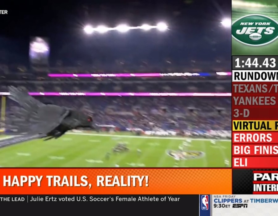 During the live production, LED boards in the stadium created the illusion that the raven was circling the stadium, standing on the field, or perched on the goal post as the team scored. Each of the raven’s interactions was fluid with the live action of the game and each of the raven’s positions was directed in real time throughout the game. Having these tools allowed the Raven’s broadcast team, Ravens Productions, to use the raven as an instrument for generating pre-game hype, while heightening anticipation during captivating in-game feats, such as touchdowns, and defensive third downs. At one critical moment, the raven was ominously perched on the goal post, virtually defending the Ravens end-zone on third-down plays.