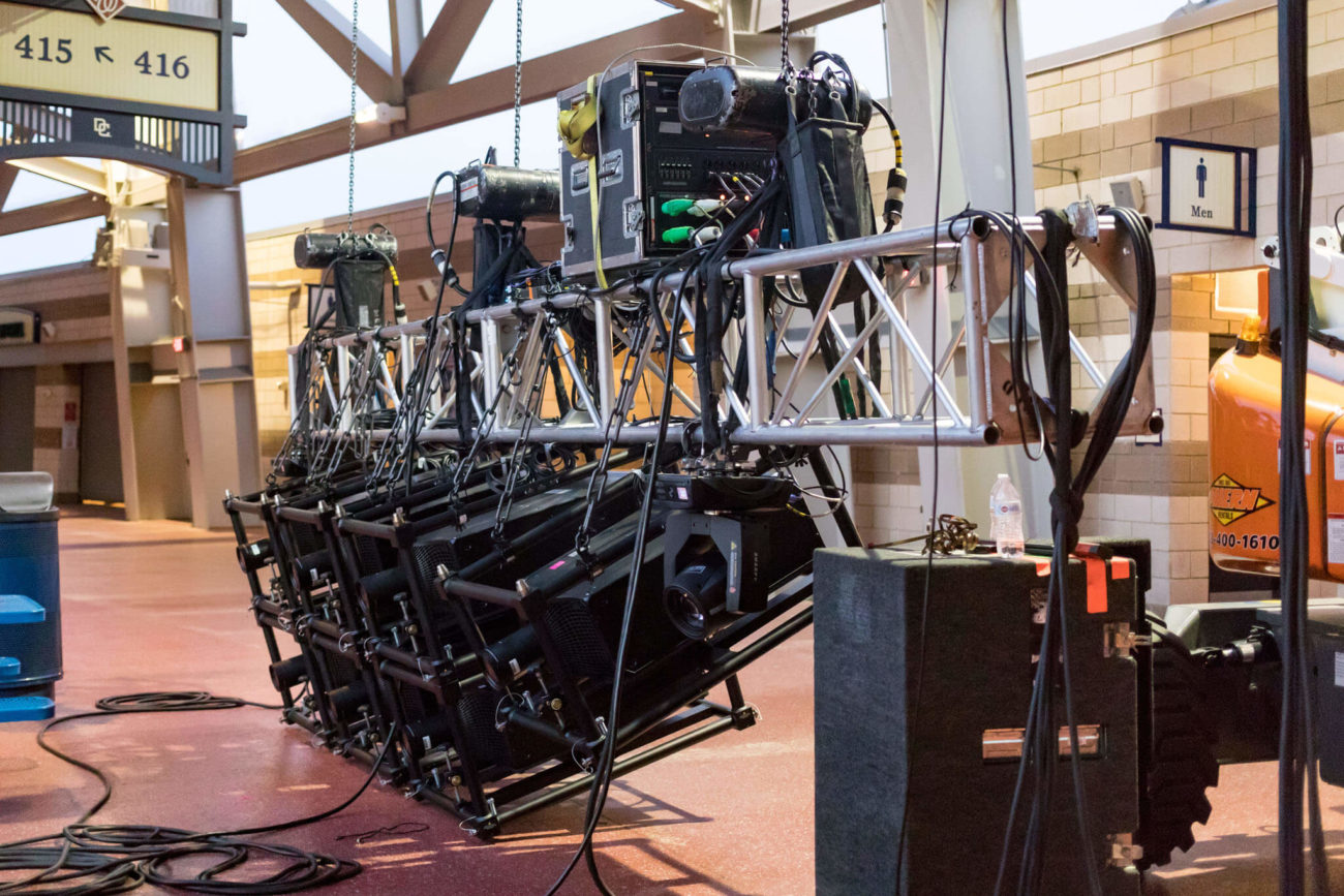 The biggest difference between standard arena activation and a field activation is media server configuration. Syncing the full 3D-workflow with all virtual projection and cameras within the 3D environment is key. In an arena environment, the overhead rigging allows for additional projector and camera angles that are not available on the field. Using 3D workflow allows us to account for the extreme angles in advance, reducing alignment time onsite.